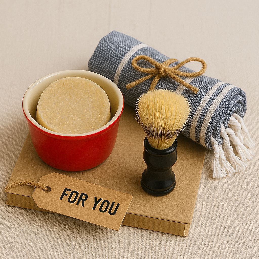 Completing the set is an Organic Turkish Cotton Face Towel. Known for its softness and absorbency, this towel enhances the shaving experience by gently drying the skin and preparing it for the perfect shave.